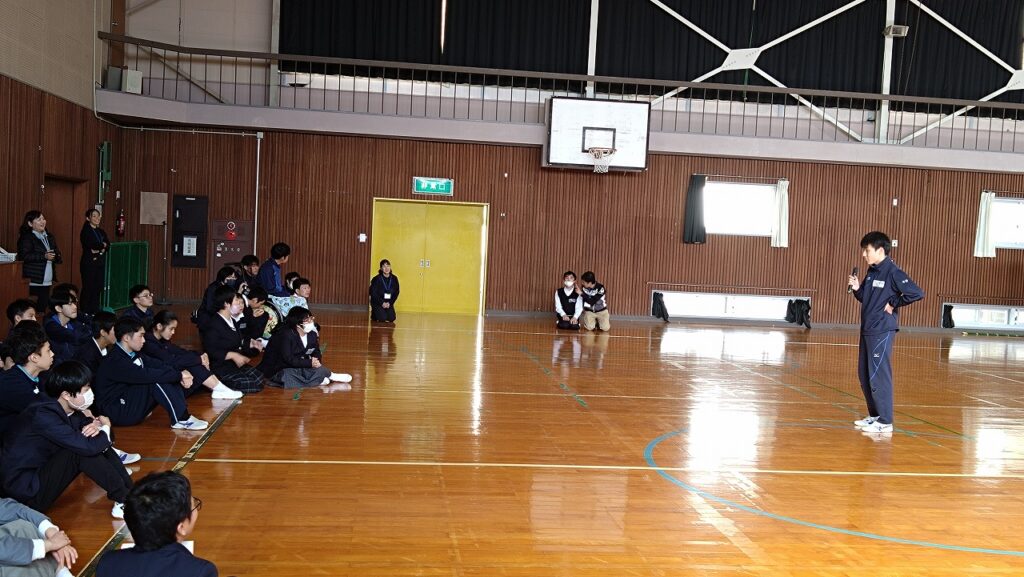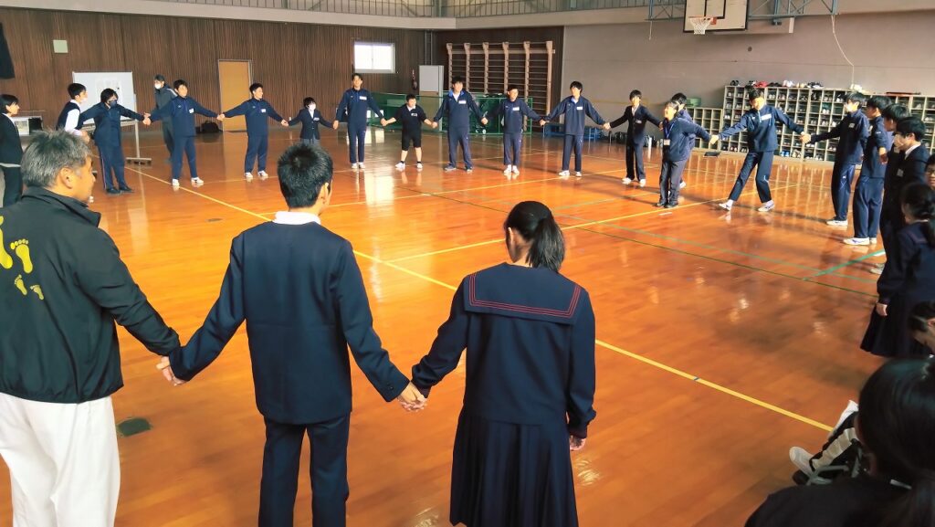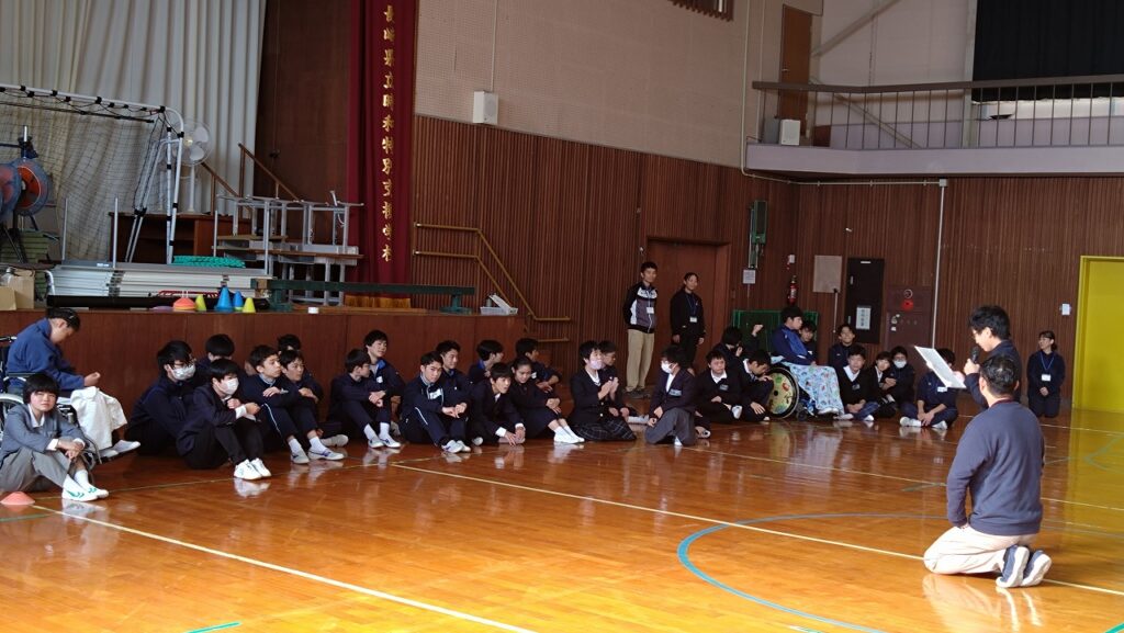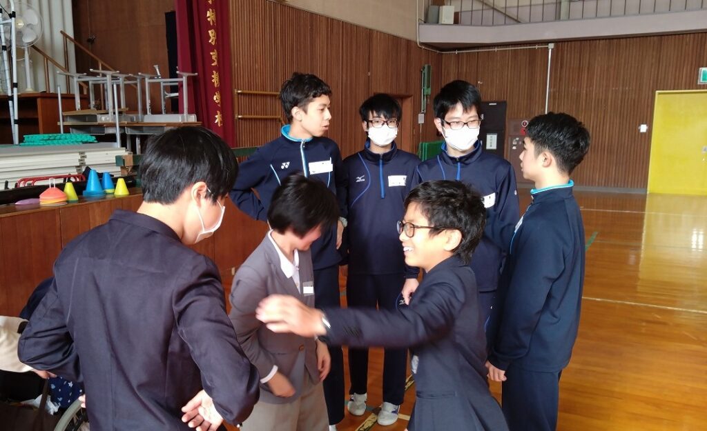 中3が時和特別支援学校(時津町)の生徒たちと交流活動を行いました。毎年行っている交流行事で、今年度も2回の交流を行う予定にしています。今回は、「お互いを知ること」「アイスブレーク」を目的として交流しました。スクールバスで移動し、体育館へ入ると時和の生徒さんたちが拍手で迎えてくれました。
