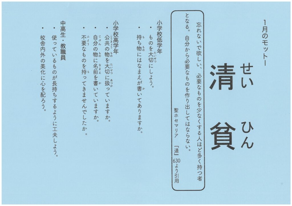 カトリックの教えについて、もっと詳しく知りたい方は、以下のリンクをご覧ください。オプス・デイ ジャパン「信仰を育む」 本校では、毎日の生活の中で、特に注意して果たしていく徳目を月ごとに決めています。児童生徒のみならず、教