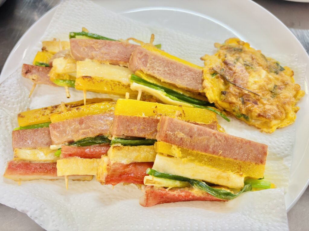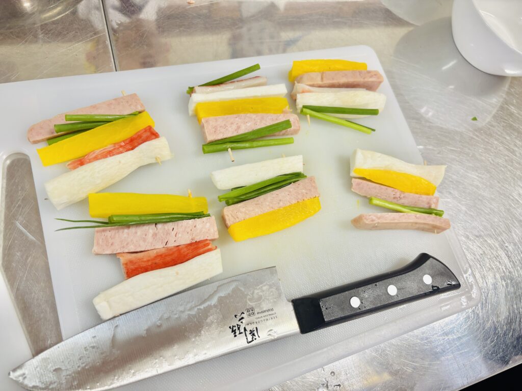 スパム・たくあん・スティックかにかま・エリンギ・小ねぎ・・・という、少々びっくりする材料を揃えてカットし、つまようじに刺しました。