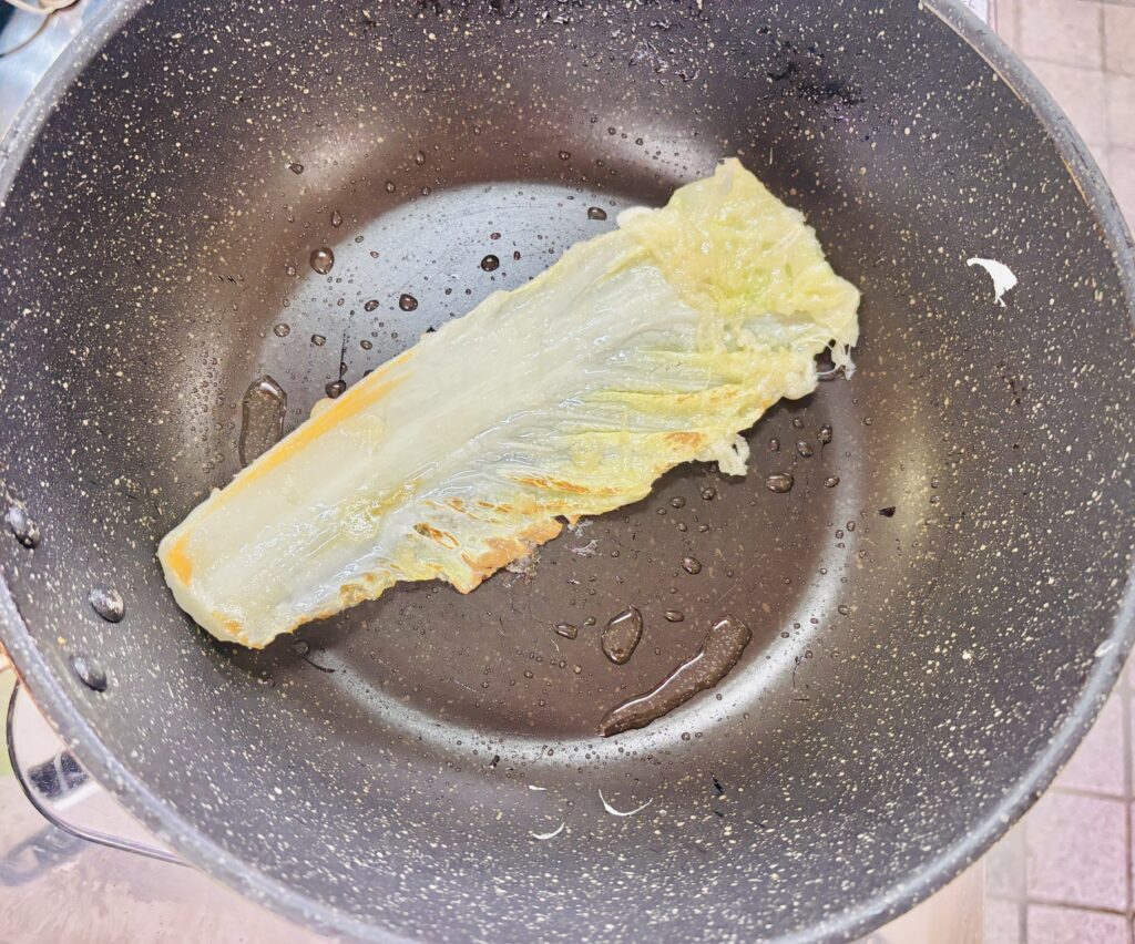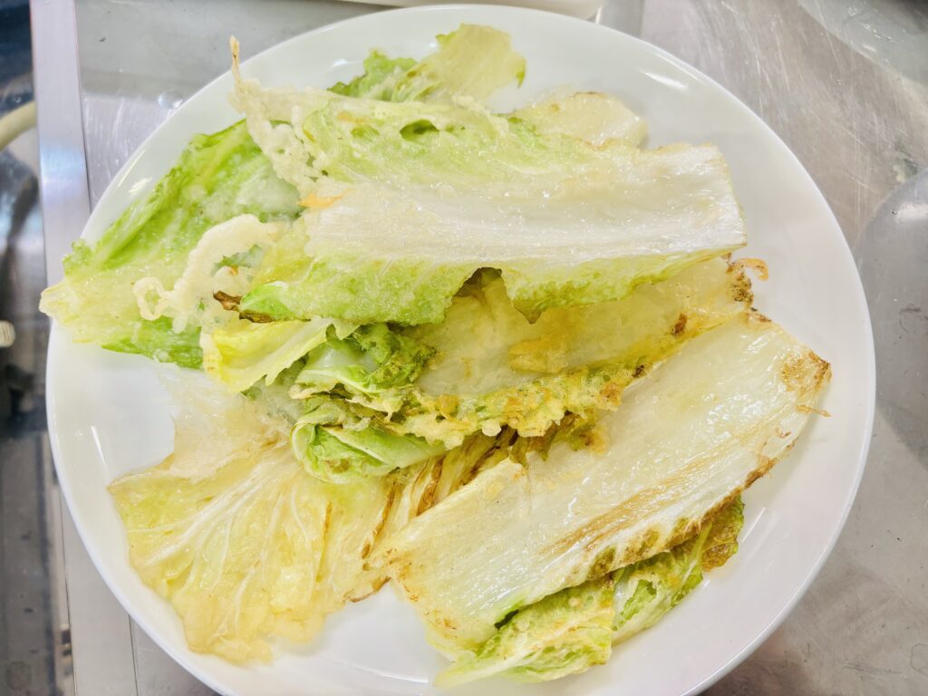白菜の葉を1枚ずつ「小麦:水=1:1」で溶いた液をくぐらせて、焼きました。