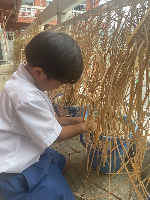 「わあ、お米がたくさん付いている!」と、子どもたちは収穫の喜びを噛み締めながら、一束ずつ丁寧にハサミで稲を切り取っていました。